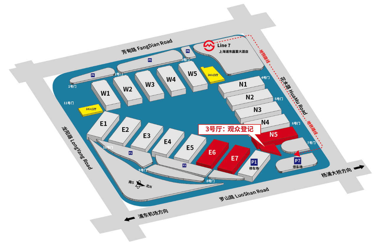 网约车/出租车:请定位“上海新国际博览中心3号入口大厅”下车(位于花木路与罗山路交叉口,或导航:上海新国际博览中心7号门)。